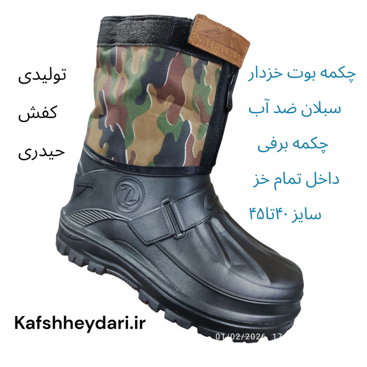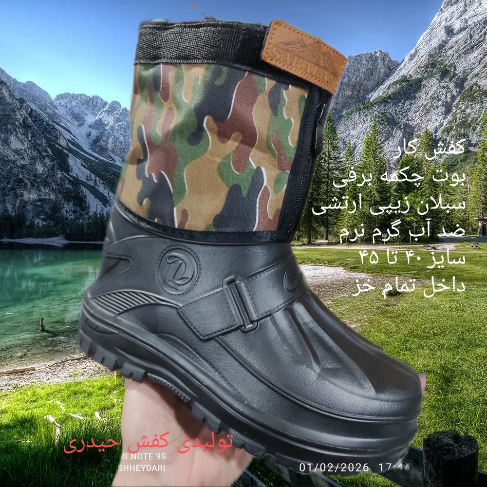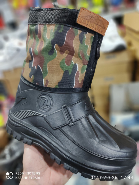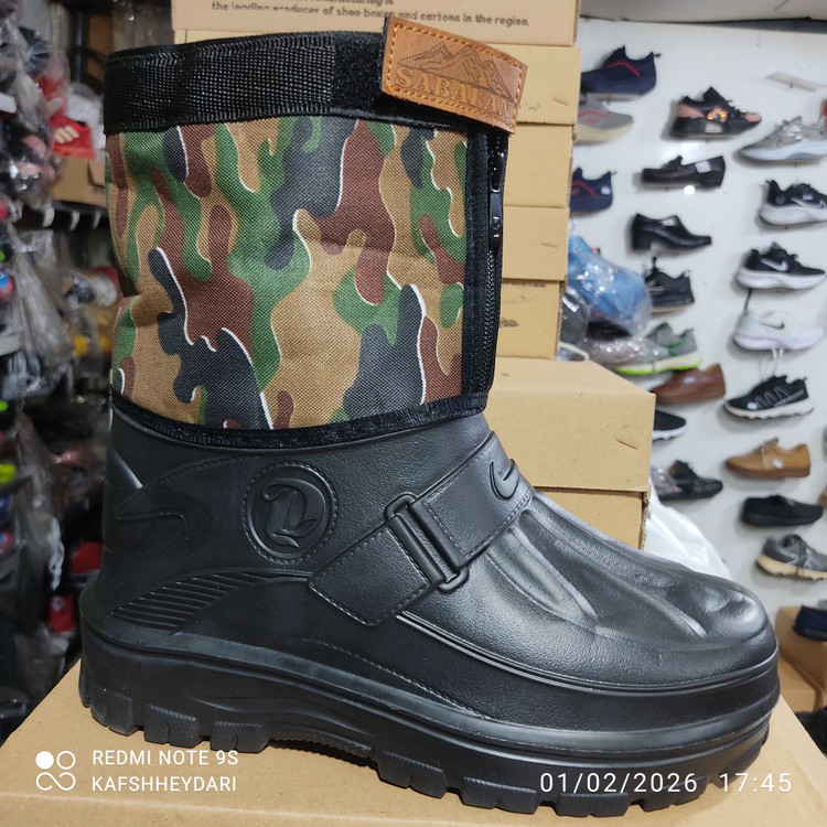 این محصول کفش ساقدار ضد آب از جنس پلاستیک avi نرم و سبک تا نیم ساق بالا ساق از جنس برزنت طرح ارتشی ضد آب باز و بست و ریگلاژ آن با یک زیپ و بالای آن و چسبی